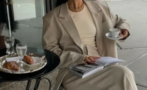 شومیز مانتویی آستین پفی یا چین دار ترکیب رنگ شومیز سفید با شلوار راسته کرم بی نظیره و جزء استایل های پر کاربرد تابستان می باشد