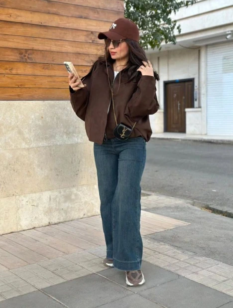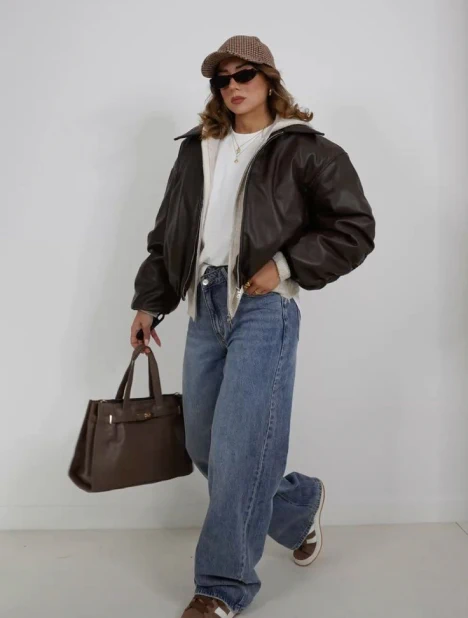 استایل کژوال با بامبرجکت چرم قهوه ای و شلوار جین
