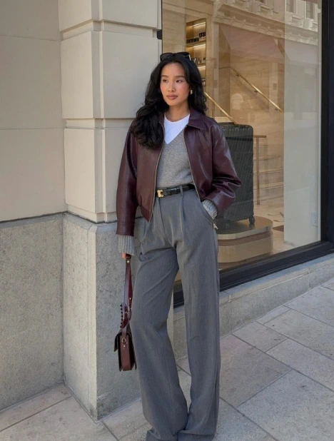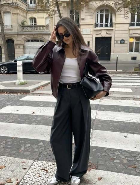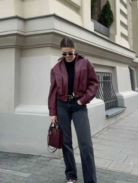 استایل خیابانی با بامبر جکت چرم زرشکی