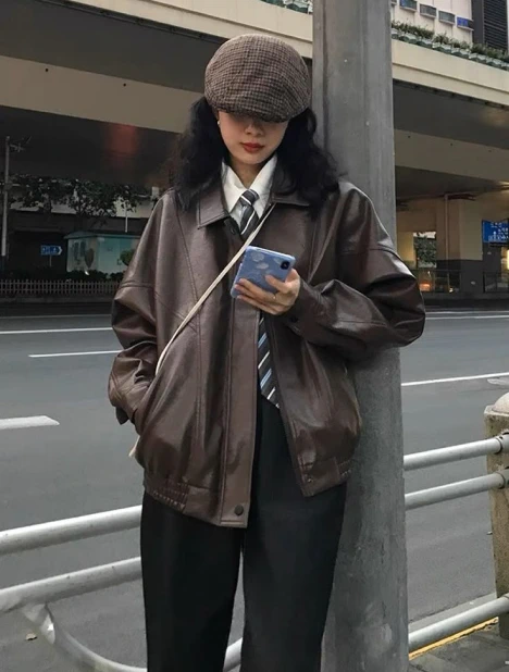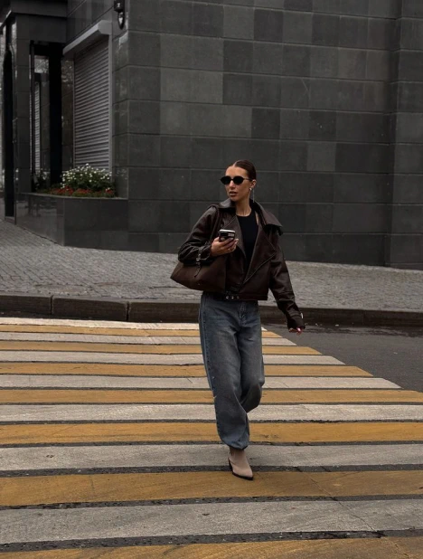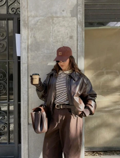 استایل روزمره با بامبر جکت چرم قهوه ای
