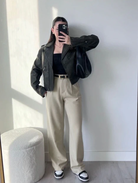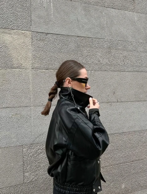 استایل خیابانی زنانه با بامبر جکت چرم مشکی
