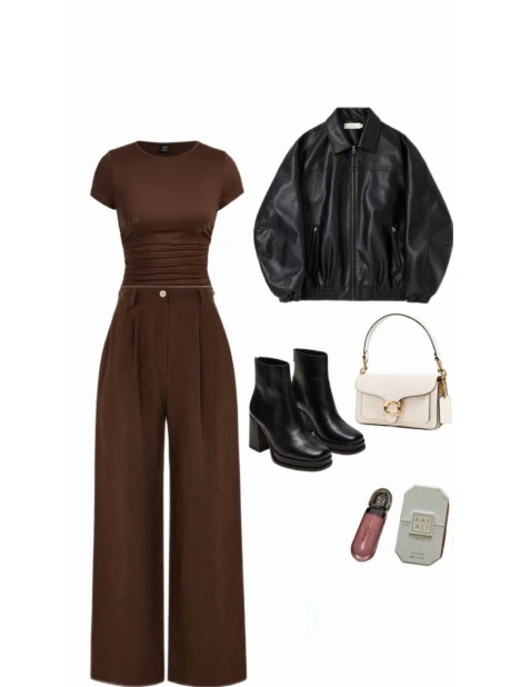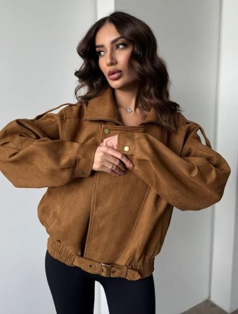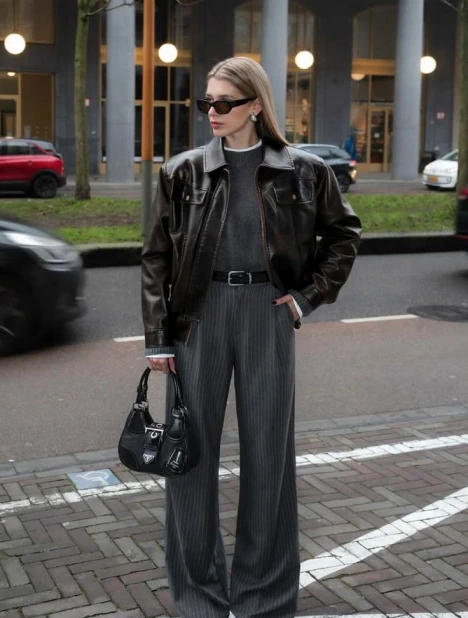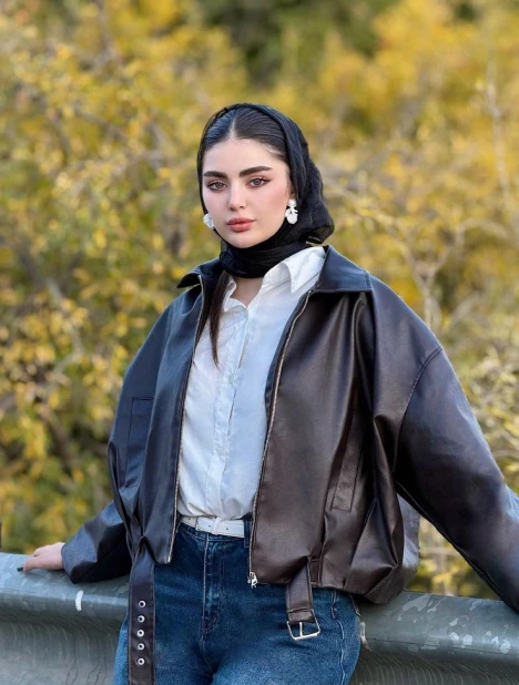 استایل پاییزی با بامبرجکت چرم قهوه ای سگک دار