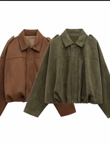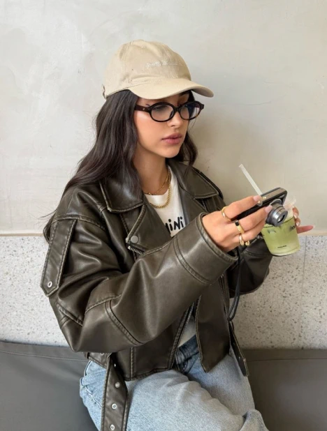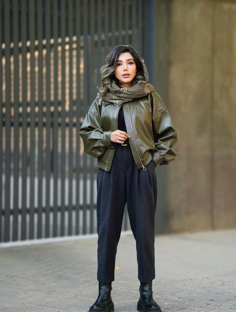 استایل پاییزی با بامبرجکت چرم زیتونی