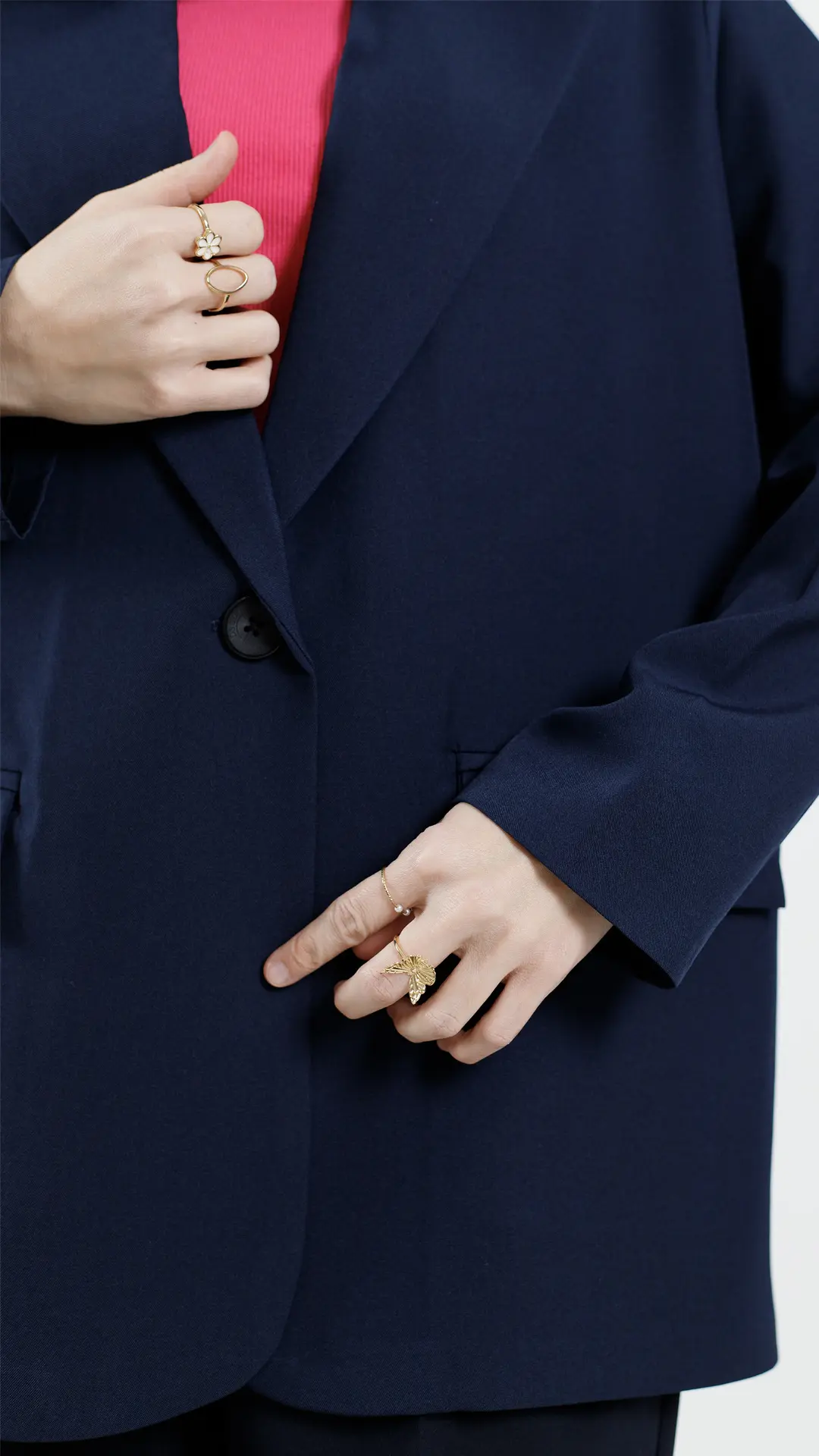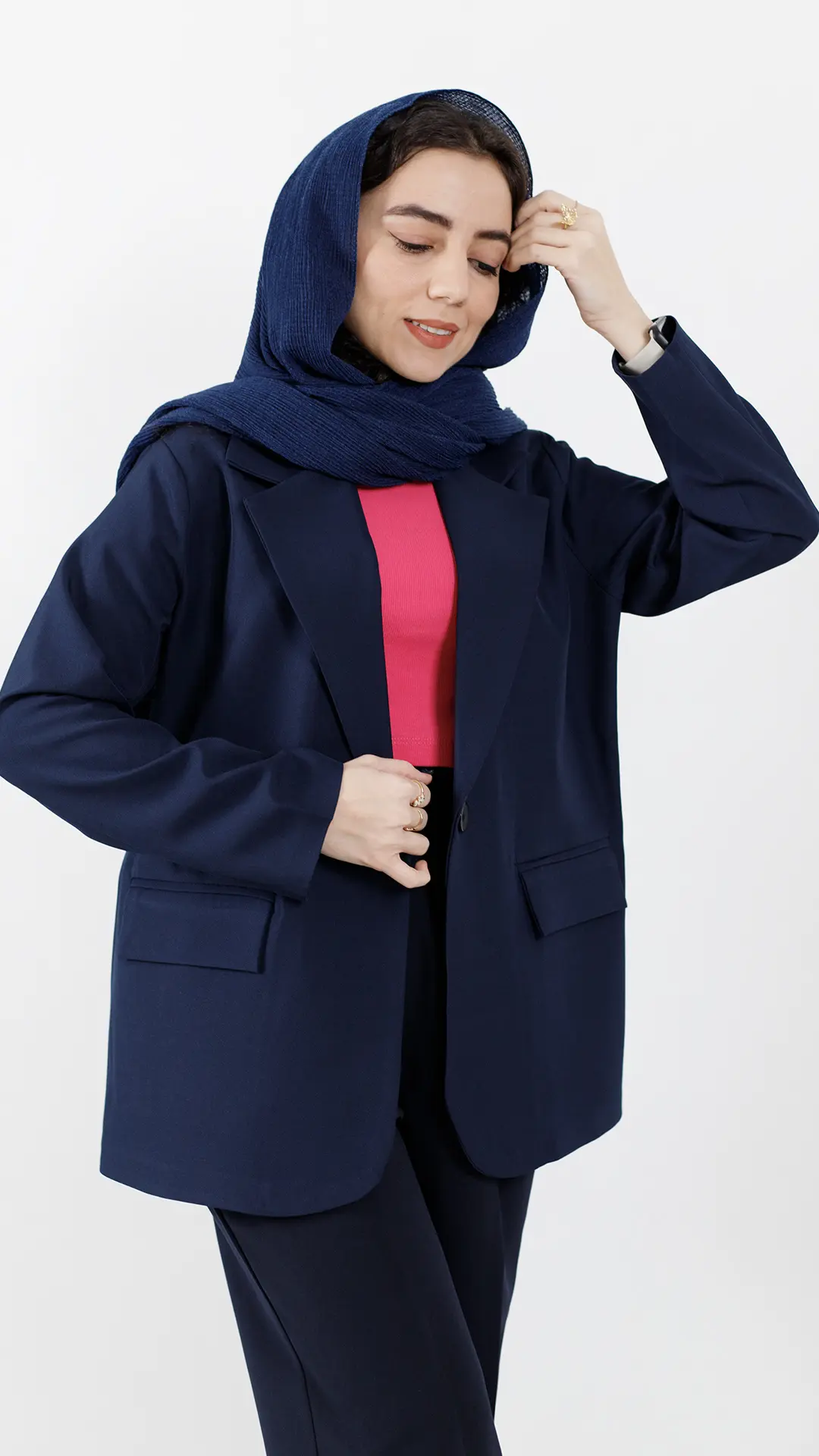 چاکهای جذاب کار و سرآستینهای دکمهخور و برگردان دوختشده، جلوهای خاص به کت داده.